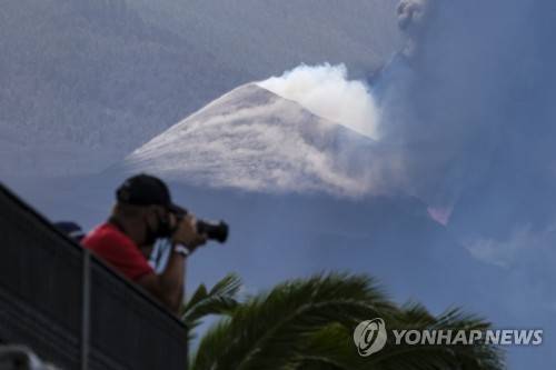 epa09499809 View of Cumbre Vieja volcano as seen from Tajuya, La Palma, Canary Islads, Spain, 01 October 2021. The sulfur dioxide (SO2) emissions by the volcano have increased, although they do not seem to be a risk for the population for now, according to the Spanish National Security Department (DSN). EPA/Angel Medina