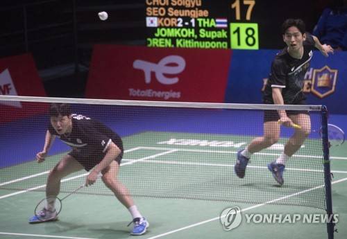epa09499808 Choi Solgyu and Seo Seungjae of Korea in action against Supak Jomkoh and Kittinupong Kedren (unseen) of Thailand during the quarterfinal tie between South Korea and Thailand at the BWF 2021 Sudirman Cup Badminton tournament in Vantaa, Finland, 01 October 2021. EPA/MAURI RATILAINEN