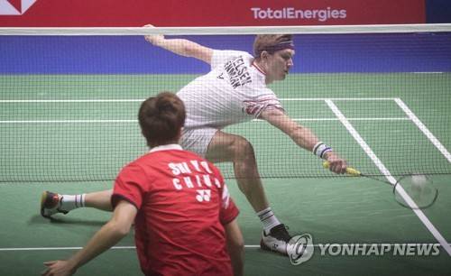 epa09499818 Viktor Axelsen (R) of Denmark in action against Shi Yu Qi of China during the quarterfinal tie between China and Denmark at the BWF 2021 Sudirman Cup Badminton tournament in Vantaa, Finland, 01 October 2021. EPA/MAURI RATILAINEN