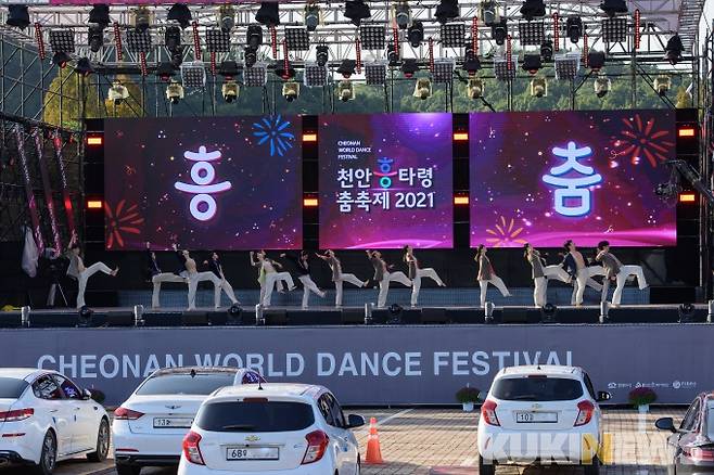 [천안=쿠키뉴스] 한상욱 기자 = 천안문화재단은 천안삼거리공원에서 자동차 공연장 방식으로 진행되고 있는 제17회 ‘천안흥타령춤축제 2021’ 2일차 프로그램이 시민들의 많은 관심 속에 화려하고 안전하게 진행됐다고 1일 밝혔다.