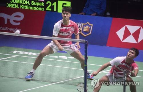 epa09499823 Supak Jomkoh and Kittinupong Kedren of Thailand in action against Choi Solgyu and Seo Seungjae of Korea (unseen) during the quarterfinal tie between South Korea and Thailand at the BWF 2021 Sudirman Cup Badminton tournament in Vantaa, Finland, 01 October 2021. EPA/MAURI RATILAINEN