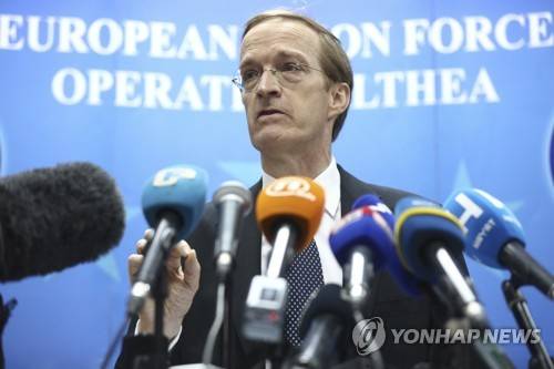 , Deputy Secretary General of the European External Action Service for Common Security and Defence Policy and Crisis Response addresses the media after a joint exercise in Butmir, near Sarajevo, Bosnia, Friday, Oct. 1, 2021. The European Union Force deployed in Bosnia and its reserve forces from across Europe, NATO troops from neighboring Kosovo and soldiers of the Bosnian Army have concluded their days-long exercise designed to show how effectively they can act if needed. (AP Photo)