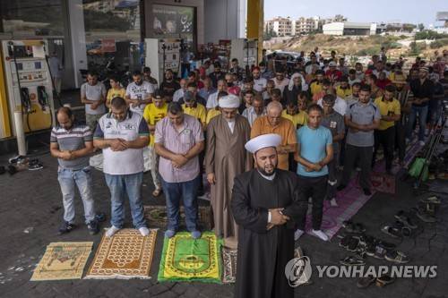 Muslim worshippers pray during Friday prayers at a gas station to protest severe fuel shortages that Lebanon has been witnessing for weeks, in the coastal town of Jiyeh, south of Beirut, Lebanon, Friday, Sept. 3, 2021. Lebanon is mired in a devastating economic and financial crisis, the worst in its modern history. A result of this has been crippling power cuts and severe shortages in gasoline and diesel that have been blamed on smuggling, hoarding and the cash-strapped government's inability to secure deliveries of oil products. (AP Photo/Hassan Ammar)