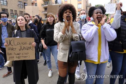 epa09499834 Students of the UCL University in Louvain la Neuve, protest against the arrest and detention of a young Congolese Junior Masudi Wasso, in Ottignie, Belgium, 01 October 2021. Junior Masudi Wasso arrived 13 days ago in Belgium with a paid inscription for economy at university and a study visa for Belgium. Custom Service at Brussels airport denied his entrance to the territory on the base of lack of knowledge in economy. The university officially complains as a students in first grade should not have knowledge before studying. Junior Masudi Wasso is now in detention for 13 days and will be soon expulsated to Congo. EPA/OLIVIER HOSLET