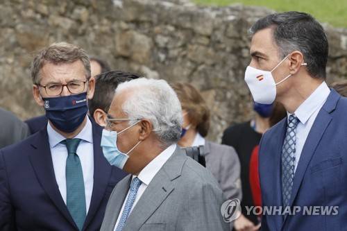 epa09499836 Spanish Prime Minister Pedro Sanchez (R), his Portuguese counterpart, Antonio Costa (C), and regional President of Galicia, Alberto Nunez Feijoo (L), arrive to attend the closing day of the III La Toja-Atlantic Tie Forum held in O Grove, in the province of Galicia, northwestern Spain, 01 October 2021. EPA/Lavandeira jr