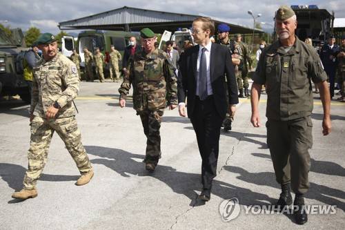 , second right, Deputy Secretary General of the European External Action Service for Common Security and Defence Policy and Crisis Response attends a joint exercise in Butmir, near Sarajevo, Bosnia, Friday, Oct. 1, 2021. The European Union Force deployed in Bosnia and its reserve forces from across Europe, NATO troops from neighboring Kosovo and soldiers of the Bosnian Army have concluded their days-long exercise designed to show how effectively they can act if needed. (AP Photo)