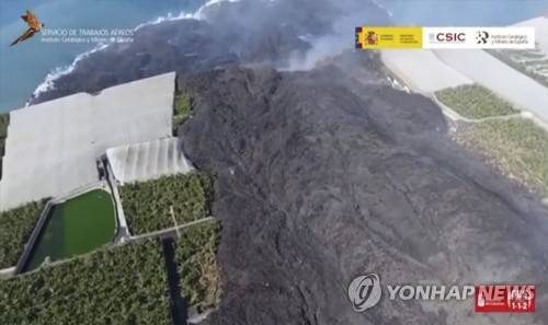 In this grab taken from Sept. 30, 2021 video made availbe by IGME-CSIC (Geological Survey of Spain), a view of lava from the erupted volcano entering the sea on the Canary island of La Palma. An erupting volcano on a Spanish island off northwest Africa has blown open another fissure on its hillside. The new fissure is the third to crack open since the Cumbre Vieja crater erupted on La Palma island on Sept. 19. Authorities were watching Friday to see whether lava from the new fissure would join the main flow that has reached the Atlantic Ocean. Officials are monitoring air quality along the shoreline. Sulfur dioxide levels in the area have risen but officials say they don't represent a health threat. (IGME-CSIC via AP) AP PROVIDES ACCESS TO THIS THIRD PARTY PHOTO SOLELY TO ILLUSTRATE NEWS REPORTING OR COMMENTARY ON FACTS DEPICTED IN IMAGE; MUST BE USED WITHIN 14 DAYS FROM TRANSMISSION; NO ARCHIVING; NO LICENSING; MANDATORY CREDIT; LOGO CANNOT BE OBSCURED