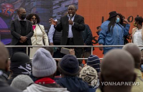 South Africa's President Cyril Ramaphosa, addresses the communality about the importance of vaccinating during the inaugural vaccination weekend drive in Katlehong, east of Johannesburg, South Africa, Friday, Oct. 1, 2021. The aim of the vaccination drive is to mobilise citizens and people living in South Africa to get vaccinated as a means to fight the COVID-19 pandemic. (AP Photo/Themba Hadebe)