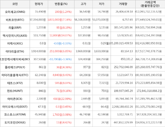 한편 거래금액 기준으로는 오미세고, 비트코인, 리플 순으로 가장 활발한 거래를 보이고 있다.