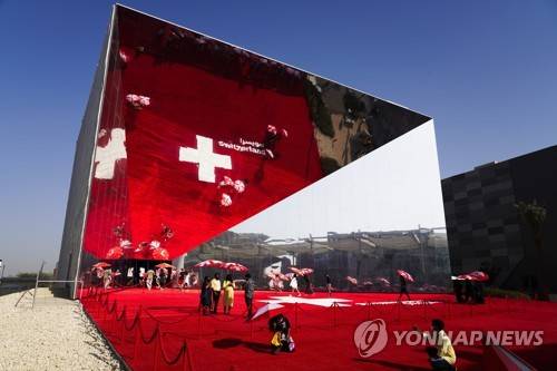 A family takes a photo in front of Switzerland's pavilion at Expo 2020 in Dubai, United Arab Emirates, Friday, Oct. 1, 2021. After eight years of planning and billions of dollars in spending, the Middle East's first ever World Fair opened on Friday in Dubai, with hopes the months-long extravaganza draws both visitors and global attention to this desert-turned-dreamscape. (AP Photo/Jon Gambrell)