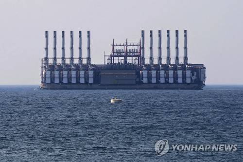 FILE - In this July 16, 2018 file photo, a floating power station waits off the coast at Jiyeh, south of Beirut, Lebanon. The Turkish company, Karpowership, supplying electricity to Lebanon from two power barges off the coast of Beirut said Friday, Oct. 1, 2021, it has halted supplies after its contract with the Lebanese state electricity company expired. (AP Photo/Bilal Hussein, File) A JULY 16, 2018 FILE PHOTO.