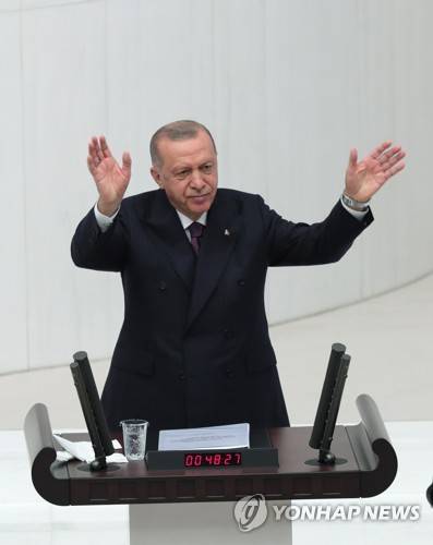 epa09499870 A handout photo made available by the Turkish President Press Office shows, Turkish President Recep Tayyip Erdogan cheering during the opening ceremony of Turkish Parliament, at the Grand National Assembly of Turkey in Ankara, Turkey, 01 October 2021. EPA/TURKISH PRESIDNET PRESS OFFICE HANDOUT HANDOUT EDITORIAL USE ONLY/NO SALES
