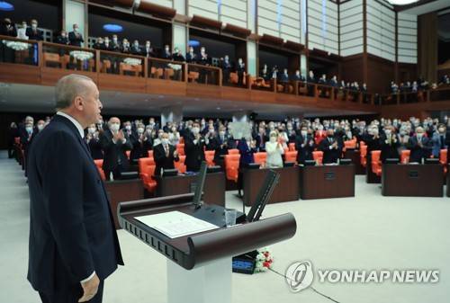 epa09499872 A handout photo made available by the Turkish President Press Office shows, Turkish President Recep Tayyip Erdogan (L) attending the opening of a new legislative year of Turkish parliament, at the Grand National Assembly of Turkey in Ankara, Turkey, 01 October 2021. EPA/TURKISH PRESIDNET PRESS OFFICE HANDOUT HANDOUT EDITORIAL USE ONLY/NO SALES