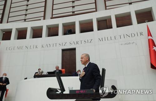epa09499873 A handout photo made available by the Turkish President Press Office shows, Turkish President Recep Tayyip Erdogan cheering during the opening ceremony of Turkish Parliament, at the Grand National Assembly of Turkey in Ankara, Turkey, 01 October 2021. EPA/TURKISH PRESIDNET PRESS OFFICE HANDOUT HANDOUT EDITORIAL USE ONLY/NO SALES