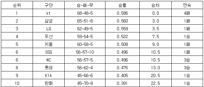 [프로야구 중간순위] 1일