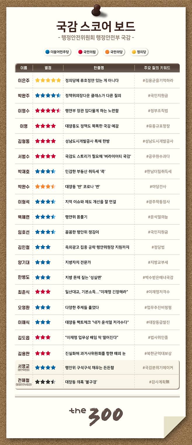 1일 국회 행정안전위원회 행정안전부 국정감사에서는 대장동 개발 특혜 의혹과 관련, 지방자치단체에 대한 감독 권한이 있는 행정안전부의 감독 소홀 여부가 주요 쟁점으로 떠오르면서 이 부분을 날카롭게 지적한 이명수 국민의힘 의원이 높은 점수를 받았다.