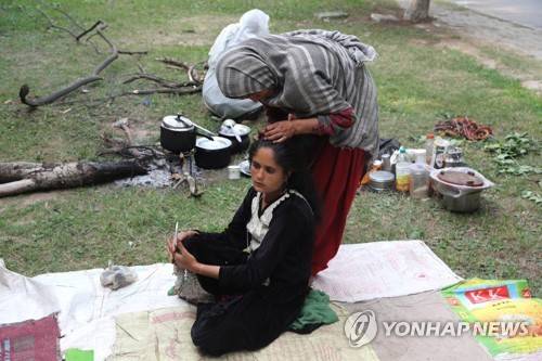 epa09499901 A Bekarwal nomad community woman cleans the head of her relative from lice at a roadside temporary camp in Srinagar, the summer capital of Indian Kashmir, 01 October 2021. The nomadic Bakerwal families have started returning back from Kashmir valley to wander in search of good pastures for their cattle as winter sets foot in Indian Kashmir. EPA/FAROOQ KHAN