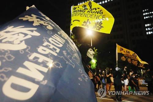 epa09499907 Protesters hold flags reading 'Hong Kong Independence' during a joint protest joint by over 20 human rights and activist groups against Chinese political persecution and totalitarianism across the world, outside the island's parliament, Taipei, Taiwan, 01 October 2021. The protest is aimed at calling upon the Taiwanese government to review on laws regarding Hong Kong Macau, standing in solidarity with the Tibet, Uyghurs, Burmese and Hongkongers, and recognising the sovereignty of Taiwan. EPA/Daniel Ceng Shou-Yi