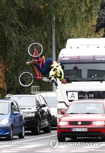 epa09499914 Colombian student Juan Pablo Rojas Cullar performs on his BMX bike at a busy intersection in downtown Zagreb, Croatia, 01 October 2021. Juan Pablo previously worked at the Italian circus Orfej and has been travelling Europe with his acrobatic performance. He lives as a street artist. EPA/ANTONIO BAT