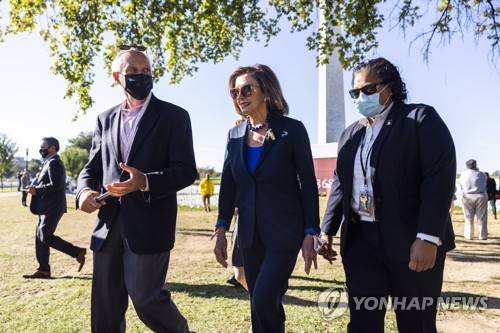 epa09499909 Speaker of the House Nancy Pelosi (C) walks along the National Mall in Washington, DC, USA, 01 October 2021. Pelosi and House lawmakers failed to vote on the infrastructure bill on 30 September, and will try again on 01 October 2021. EPA/JIM LO SCALZO