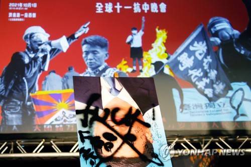 epa09499937 A portrait of Chinese President Xi Jinping is painted with foul languages in Chinese and English during a joint protest joint by over 20 human rights and activist groups against Chinese political persecution and totalitarianism across the world, outside the island's parliament, Taipei, Taiwan, 01 October 2021. The protest is aimed at calling upon the Taiwanese government to review on laws regarding Hong Kong Macau, standing in solidarity with the Tibet, Uyghurs, Burmese and Hongkongers, and recognising the sovereignty of Taiwan. EPA/Daniel Ceng Shou-Yi