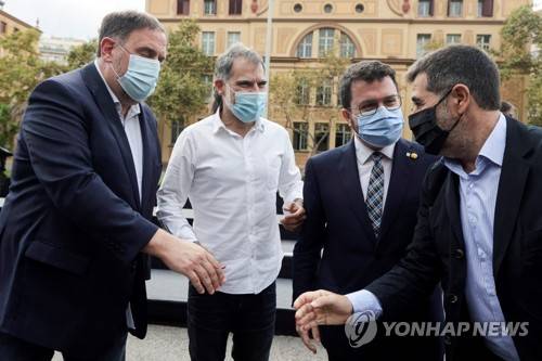 epa09499946 Catalonia's regional president, Pere Aragones (2-R), ERC Party's leader Oriol Junqueras (L), Junts Party's leader Jordi Sanchez (R) and Omnium Cultural (a pro-independence organization) president Jordi Cuixart (2-L) attend a commemorative act for the 4th anniversary of the Catalan independence referendum of 2017 held in Barcelona, Catalonia, Spain, 01 October 2021. EPA/Quique Garcia
