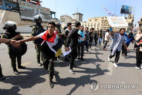 epa09499963 Iraqi anti-riot police stand guard as Iraqi protesters take part in a demonstration at Tahrir squaer in central Baghdad, Iraq, 01 October 2021. Hundreds of Iraqi protesters marched in Baghdad to mark the second anniversary of the mass anti-government protests that erupted in Iraq on 01 October 2019. The protesters called for reform and demand to put on trial those who are responsible for the killed protesters. EPA/AHMED JALIL