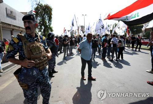 epa09499970 Iraqi policemen stand guard as protesters take part in a demonstration at Tahrir squaer in central Baghdad, Iraq, 01 October 2021. Hundreds of Iraqi protesters marched in Baghdad to mark the second anniversary of the mass anti-government protests that erupted in Iraq on 01 October 2019. The protesters called for reform and demand to put on trial those who are responsible for the killed protesters. EPA/AHMED JALIL