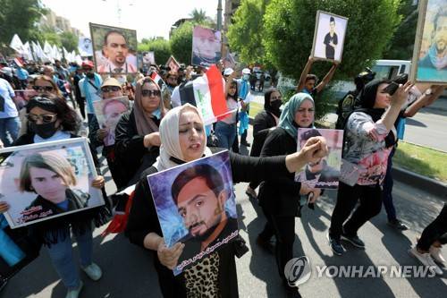 epa09499972 Iraqi protesters carry the images of protest victims, as they take part in a demonstration at central Baghdad, Iraq, 01 October 2021. Hundreds of Iraqi protesters marched in Baghdad to mark the second anniversary of the mass anti-government protests that erupted in Iraq on 01 October 2019. The protesters called for reform and demand to put on trial those who are responsible for the killed protesters. EPA/AHMED JALIL