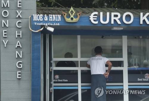 epa09499991 A man waits for the cash in front of a money exchange shop in Yangon, Myanmar, 01 October 2021. Food and commodity prices go up along with fuel price due to Myanmar currency price instability. Myanmar currency hits record low after 60 percent dropped in eight months amid economic turmoil caused by the military takeover on 01 February 2021. EPA/STRINGER