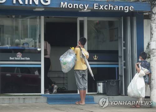epa09499990 Boys holding food and plastic bottles look inside a money exchange shop, Yangon, Myanmar, 01 October 2021. Food and commodity prices go up along with fuel price due to Myanmar currency price instability. Myanmar currency hits record low after 60 percent dropped in eight months amid economic turmoil caused by the military takeover on 01 February 2021. EPA/STRINGER