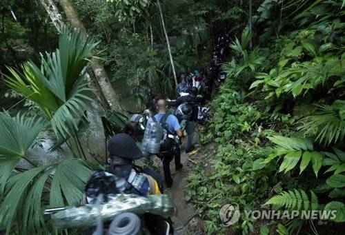 epa09499994 Haitian migrants walk on their way to Panama through the Darien Gap in Acandi, Colombia, 28 September 2021 (issued 01 October 2021). In the Darien jungle, the steps and gasps of the Haitian migrants are mixed with the 'an ale' (let's go in Creole) of the 'guides' who take them to the border of Panama. Half a thousand people, most of them Haitians, walk in a silent human line on muddy paths, crossing the river that every few meters gets in the way and creeps into them. EPA/MAURICIO DUENAS CASTANEDA