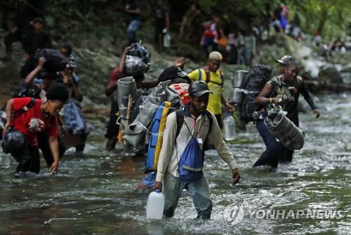 epa09499998 Haitian migrants walk on their way to Panama through the Darien Gap in Acandi, Colombia, 28 September 2021 (issued 01 October 2021). In the Darien jungle, the steps and gasps of the Haitian migrants are mixed with the 'an ale' (let's go in Creole) of the 'guides' who take them to the border of Panama. Half a thousand people, most of them Haitians, walk in a silent human line on muddy paths, crossing the river that every few meters gets in the way and creeps into them. EPA/MAURICIO DUENAS CASTANEDA