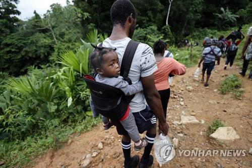 epa09500001 Haitian migrants walk on their way to Panama through the Darien Gap in Acandi, Colombia, 28 September 2021 (issued 01 October 2021). In the Darien jungle, the steps and gasps of the Haitian migrants are mixed with the 'an ale' (let's go in Creole) of the 'guides' who take them to the border of Panama. Half a thousand people, most of them Haitians, walk in a silent human line on muddy paths, crossing the river that every few meters gets in the way and creeps into them. EPA/MAURICIO DUENAS CASTANEDA