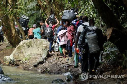 epa09499999 Haitian migrants walk on their way to Panama through the Darien Gap in Acandi, Colombia, 28 September 2021 (issued 01 October 2021). In the Darien jungle, the steps and gasps of the Haitian migrants are mixed with the 'an ale' (let's go in Creole) of the 'guides' who take them to the border of Panama. Half a thousand people, most of them Haitians, walk in a silent human line on muddy paths, crossing the river that every few meters gets in the way and creeps into them. EPA/MAURICIO DUENAS CASTANEDA