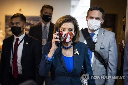 epa09500012 Speaker of the House Nancy Pelosi (C) walks to a House caucus meeting in the US Capitol in Washington, DC, USA, 01 October 2021. Pelosi and House lawmakers failed to vote on the infrastructure bill on 30 September, and will try again on 01 October 2021. EPA/JIM LO SCALZO