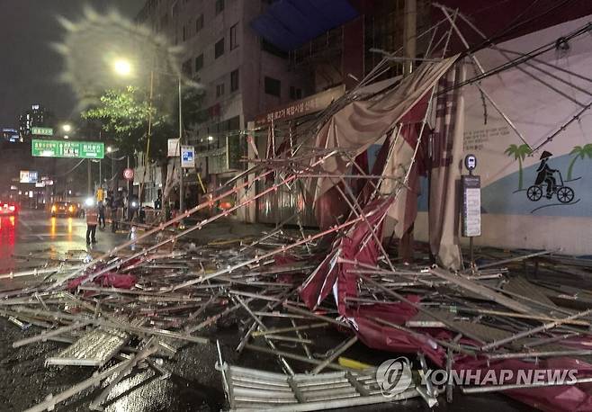 (서울=연합뉴스) 강한 비바람이 몰아친 1일 저녁 서울 원효로 인근 공사현장 구조물이 무너져 있다. 2021.10.1 [용산소방서 제공. 재판매 및 DB금지]