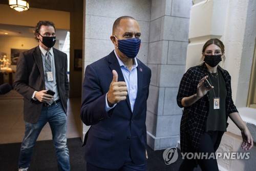 epa09500014 Democratic lawmaker from New York Hakeem Jeffries (C) walks to a House caucus meeting in the US Capitol in Washington, DC, USA, 01 October 2021. Speaker of the House Nancy Pelosi and House lawmakers failed to vote on the infrastructure bill on 30 September, and will try again on 01 October 2021. EPA/JIM LO SCALZO
