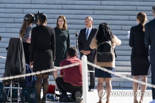 Chief Justice John Roberts, right center, stands with Associate Justice Amy Coney Barrett, left center, after her investiture ceremony at the Supreme Court, Friday, Oct. 1, 2021, in Washington. (AP Photo/Alex Brandon)