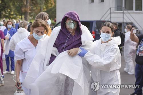 Medical staff support a patient breathing through an oxygen mask after a fire in the COVID-19 ICU section of the Hospital for Infectious Diseases in the Black Sea port of Constanta, Romania, Friday, Oct. 1, 2021. Authorities say a fire at a hospital in Romania’s port city of Constanta has killed nine COVID-19 patients in the ICU. All patients have been evacuated following Friday's blaze at Constanta’s Hospital for Infectious Diseases. (AP Photo/Costin Dinca)