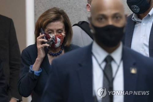 House Speaker Nancy Pelosi of Calif., talks on her phone as she arrives for a meeting with House Democrats, Friday, Oct. 1, 2021, on Capitol Hill in Washington. (AP Photo/Jacquelyn Martin)