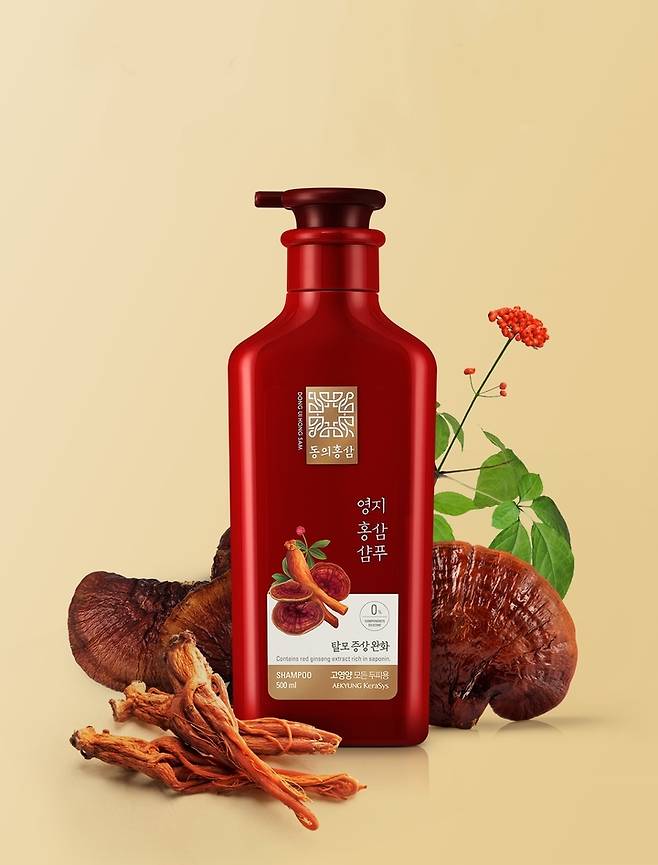 애경산업 케라시스 '동의홍삼 영지홍삼 샴푸'는 영지버섯 추출물과 홍삼 에센스를 함유한다. 두피 영양 공급은 물론 식품의약품안전처 보고를 완료한 탈모 증상 완화 기능성 화장품이다.
