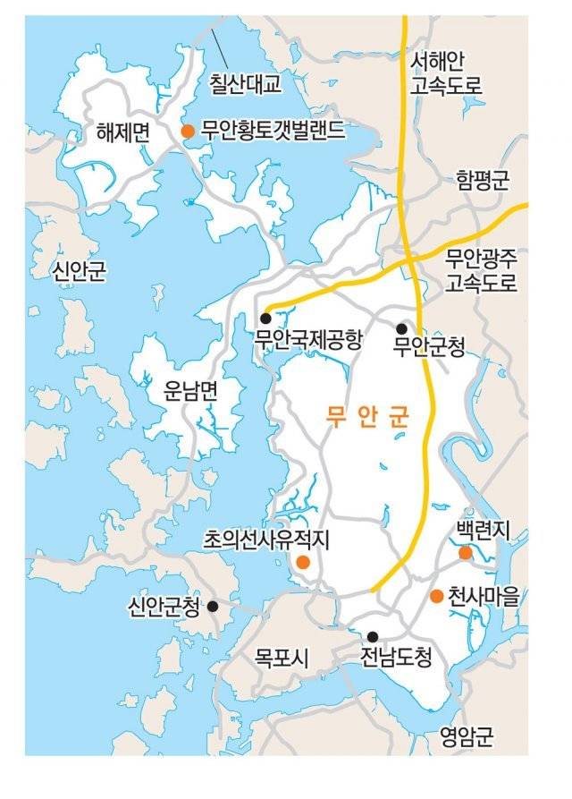 무안의 도로를 달리다 보니 차창 밖으로 붉은빛을 띤 누르스름한 황톳길이 이어진다. 무안군은 해안선을 중심으로 전체 면적의 70% 이상이 황토로 이뤄져 있다. 황토는 칼륨, 철, 마그네슘, 게르마늄 등이 풍부한 비옥한 흙. 무안 황토 양파는 전국 양파 생산량의 20% 이상을 차지할 정도. 대한민국 1위의 명성을 지키고 있다. 황토밭에서 자란 고구마, 무안의 황토 갯벌에서 자란 뻘낙지도 유명하다.
