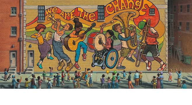 소녀는 여행길에서 여러 친구들을 만난다. 때로 그들은 듣고 싶지 않다는 듯 귀를 막기도 하지만, 함께 공원의 쓰레기를 치우고 낡은 집을 손보며 조금씩 소녀의 노래에 공감한다. 피부색이 밝은지 어두운지, 부자인지 아닌지는 중요하지 않다. 기타에서 트럼펫, 북과 탬버린으로 악대의 행렬은 점점 늘어나고 음악 소리는 더욱 크게 울린다. 마침내 소녀는 독자에게도 악기를 내민다. “다 같이 변화의 울림을 들어 보아요. 그리고 함께 노래하지 않을래요?”