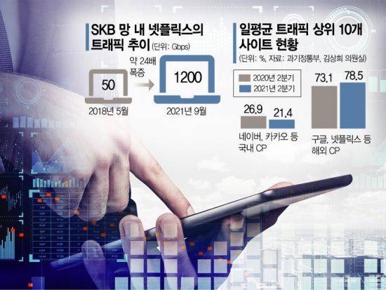 [아시아경제 조슬기나 기자] 문재인 정부 임기 중 마지막 국회 국정감사 첫날인 1일 국회 과학기술정보방송통신위원회 국정감사에서는 플랫폼 독과점, 5G 이동통신 이슈와 함께 국내에서 막대한 트래픽을 일으키고도 사용료 한 푼 내지 않는 넷플릭스 등 해외 콘텐츠제공사업자(CP)들이 망 이용대가 이슈가 도마 위에 올랐다. 오는 5일 국감에서는 넷플릭스측 증인이 출석하며 '망 무임승차' 논란이 더 집중적으로 다뤄질 것으로 예상된다.