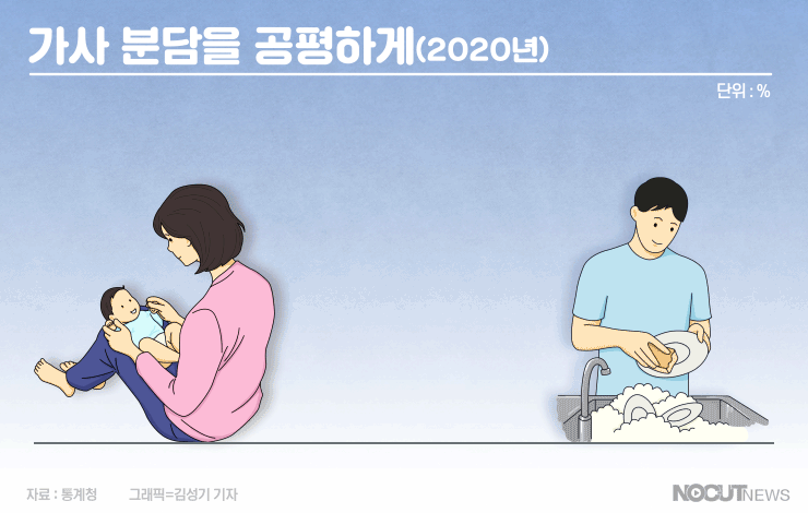 지난해 통계청 조사에 따르면 '부부가 가사를 공평하게 분담해야 한다'는 의견에 동의하는 비율은 2006년부터 꾸준히 증가해 지난해 남성 57.9%, 여성 67%였다. 조사 대상자의 62.5%는 성별에 상관없이 가사를 공평하게 분담해야 한다고 답했다.