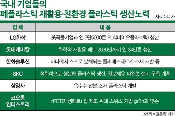 기업들은 폐플라스틱에서 화학적 공정을 통해 원재료나 에너지원을 뽑아내는 기술에도 집중하고 있다. 여기엔 SK지오센트릭·효성티앤씨·롯데케미칼·한화솔루션 등이 나서고 있다.