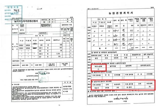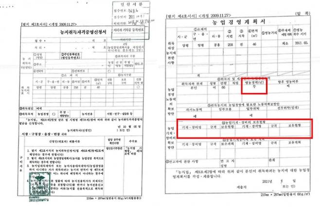 2011년 농지 추가 구입 때 낸 영농계획서에 '농업기계·장비 보유 현황' 없어…영농 경험도 없다고 신고