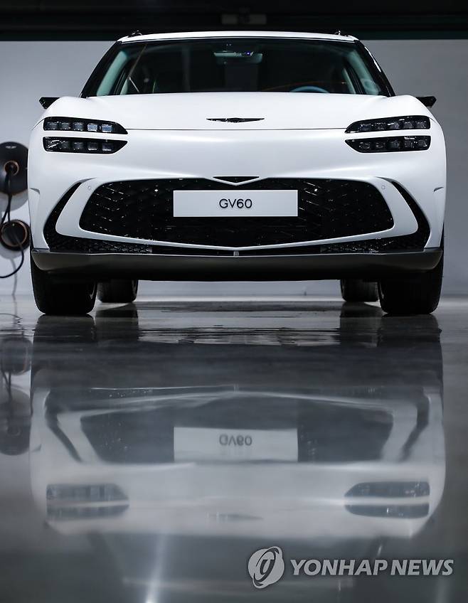 (서울=연합뉴스) 류효림 기자 = 서울 강남구 압구정동 카페캠프통에 마련된 제네시스 GV60 특별전시장에서 제네시스 첫 전용 전기차 GV60을 공개하고 있다. 2021.10.2