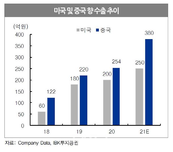 이민희 연구원은 “올해 중국 수출이 50% 증가해 전사 매출성장을 견인할 전망”이라며 “미국 수출도 올해 25% 늘어 지난해 수출 증가율 11%를 크게 웃돌 것으로 보인다”고 분석했다.
